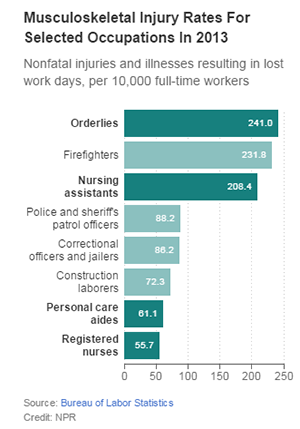 As NPR has been reporting in its Injured Nurses series, nursing employees suffer more back and arm injuries than just about any other occupations.