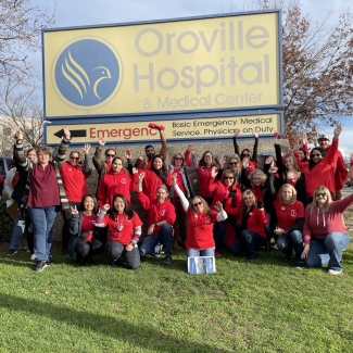 Large group of nurses outside San Joquin General Hospital, smiling and holding signs "RNs On Strike" and "Respect Nurses"